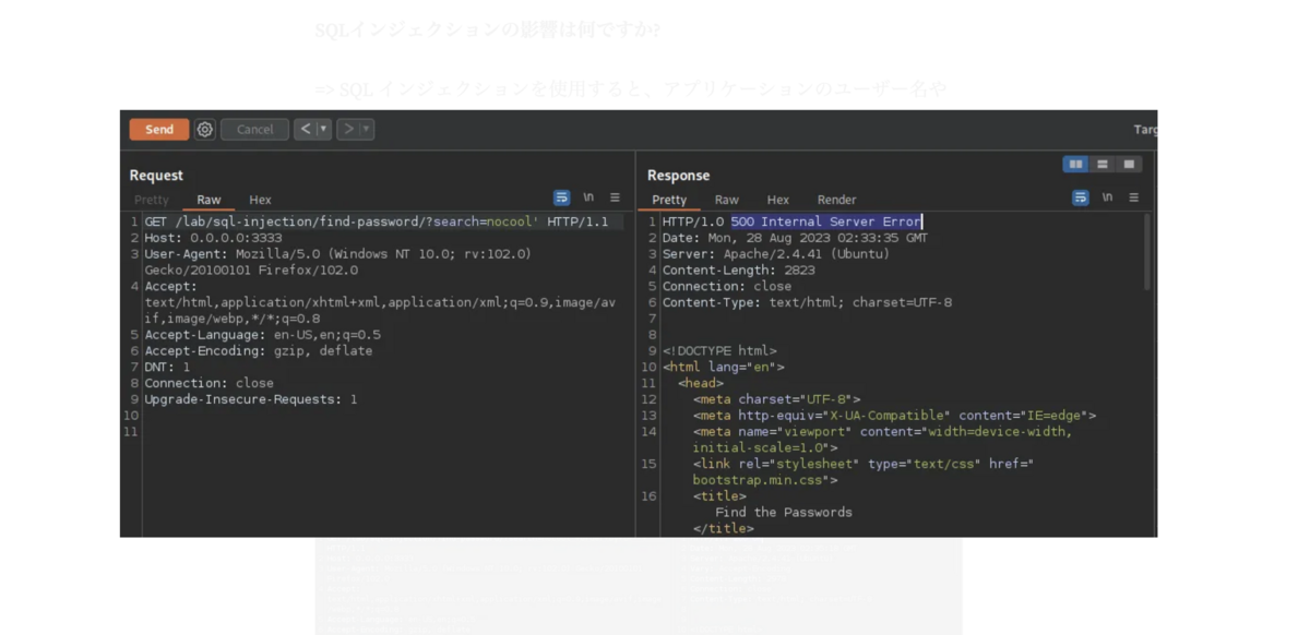 アプリケーションのエラーを参照するために使用される URL パラメータに一重引用符または二重引用符 (「'/"」) を追加し(例:?search=nocool')。