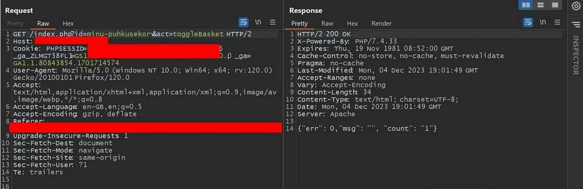 SQLインジェクションを試してみることにしたので、エンドポイントを使用してBurp Suiteにリクエストを送信します: https://example.com/index.php?id=my-holiday-basket