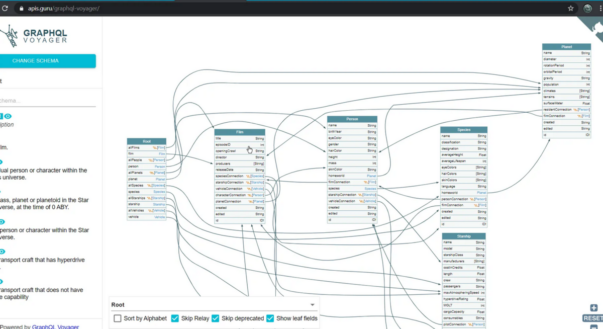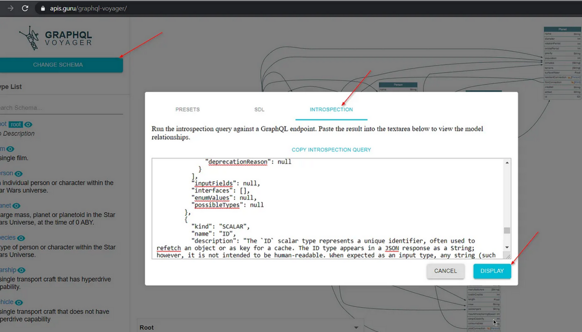 これを実行すると、応答が非常に大きくなり、理解しにくくなる可能性があります。 スキーマを理解する最良の方法は、それを視覚化することです。 これを行うには、応答本文全体をコピーし、このWeb サイト https://apis.guru/graphql-voyager/ を使用して、「スキーマの変更」ボタンをクリックし、「イントロスペクション」タブに移動して、そこにイントロスペクション クエリを貼り付けます。