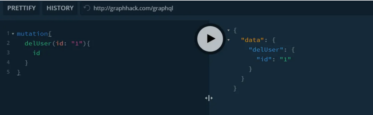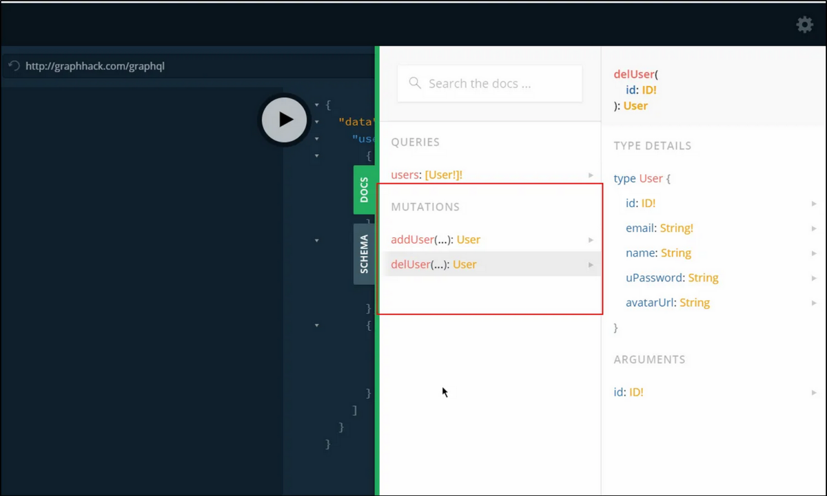 さて、突然変異部分を見ると、フロントエンドでは利用できない別の関数がわかります。 関数を実行すると、ID の引数を 1 つ受け取ることもわかります。試してみましょう。