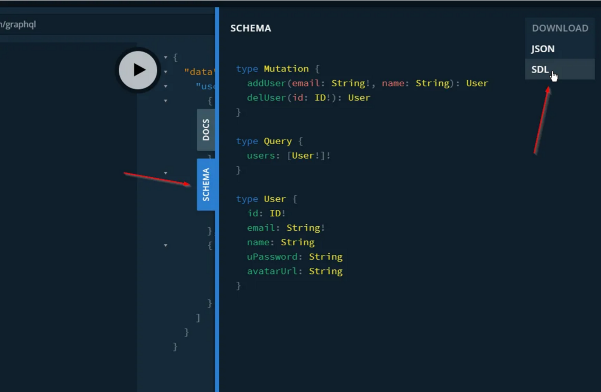 しかし、これも視覚化したいと思います。 ここで行うことは、[ドキュメント] タブをクリックして、SDL 形式でスキーマをダウンロードすることです。