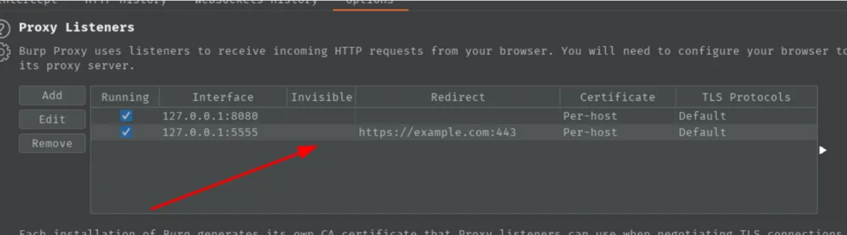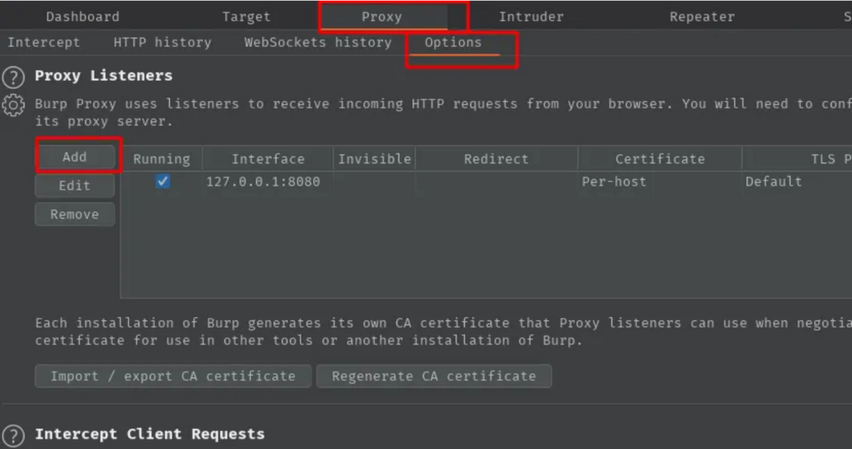 例: トラフィックが次のようになると想像してください。 https://example.com/graphqlburp > プロキシ > オプションに移動し、リスナーの下で追加をクリックし、任意のポートを追加します。