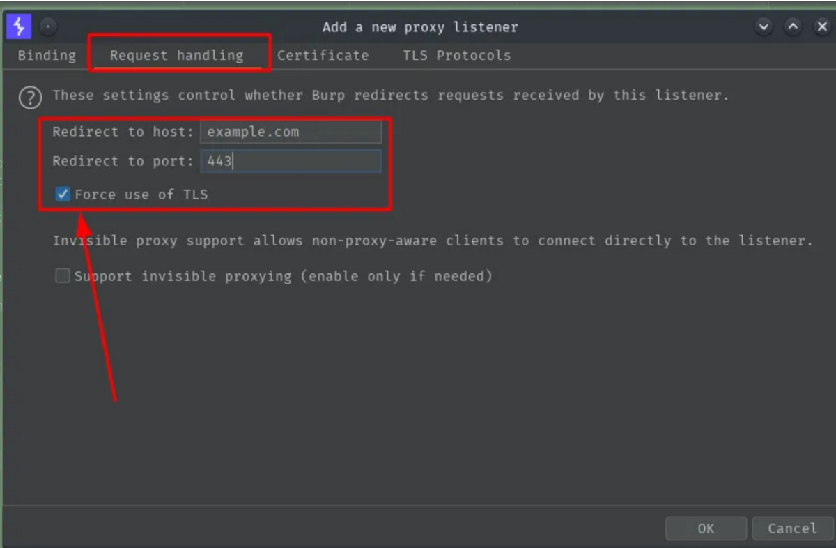 次に、「リクエスト処理」をクリックし、ターゲットのホスト/ドメインを「ホストへのリダイレクト:」に追加し、「TLS の使用を強制する」をクリックすると、自動的にポート 443 が入力され、「OK」をクリックします。