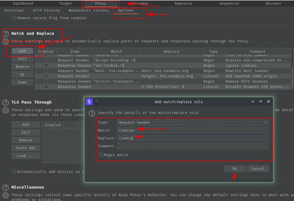 次に、げっぷに移動し、[プロキシ]タブ > [オプション] > [一致と置換] > [追加]に移動し、タイプで [リクエスト ヘッダー] を選択し、「Cookiex」と一致し、Cookie に置き換えます。 [OK] をクリックすると、準備は完了です。