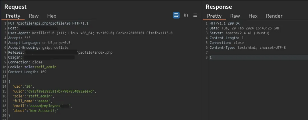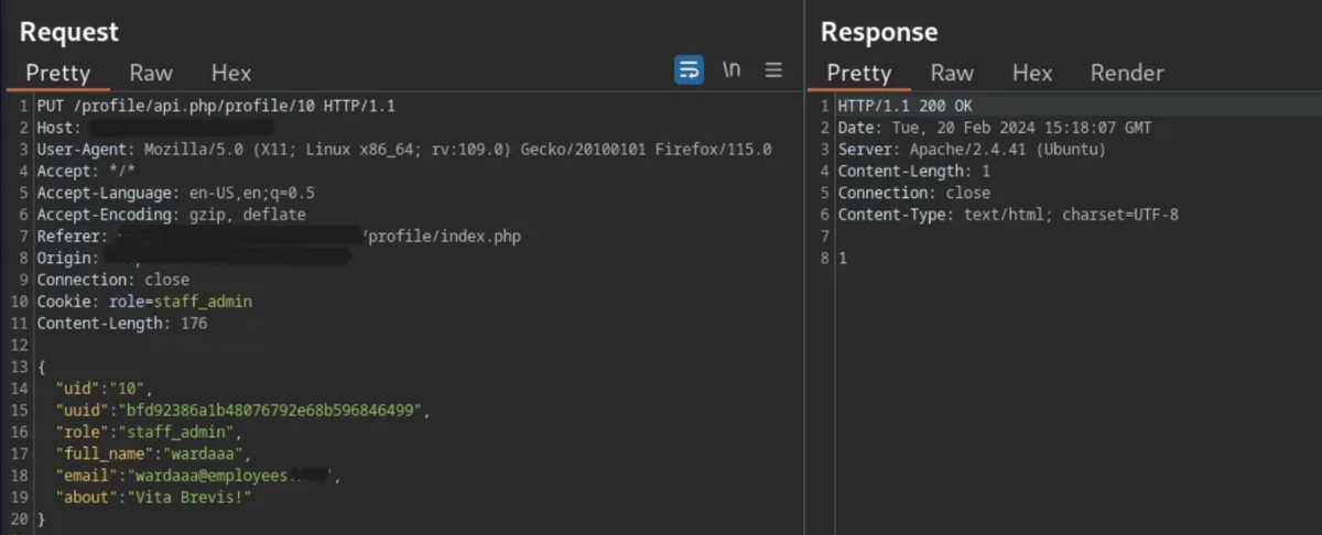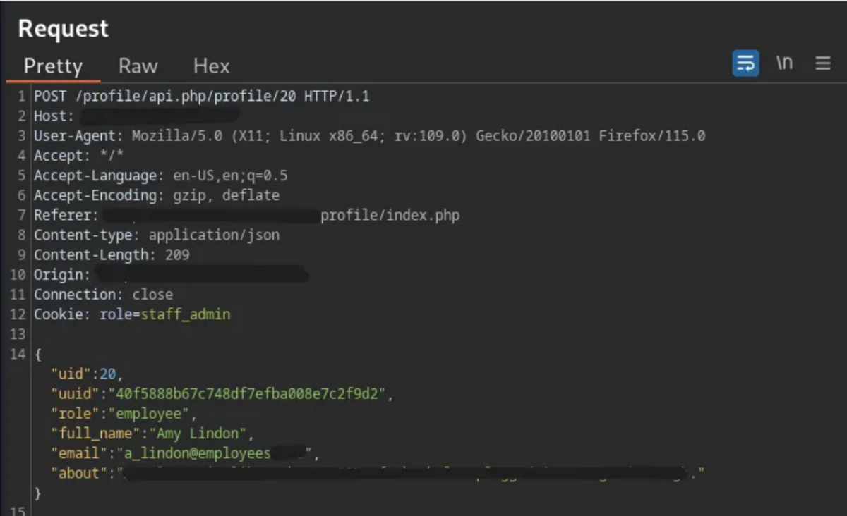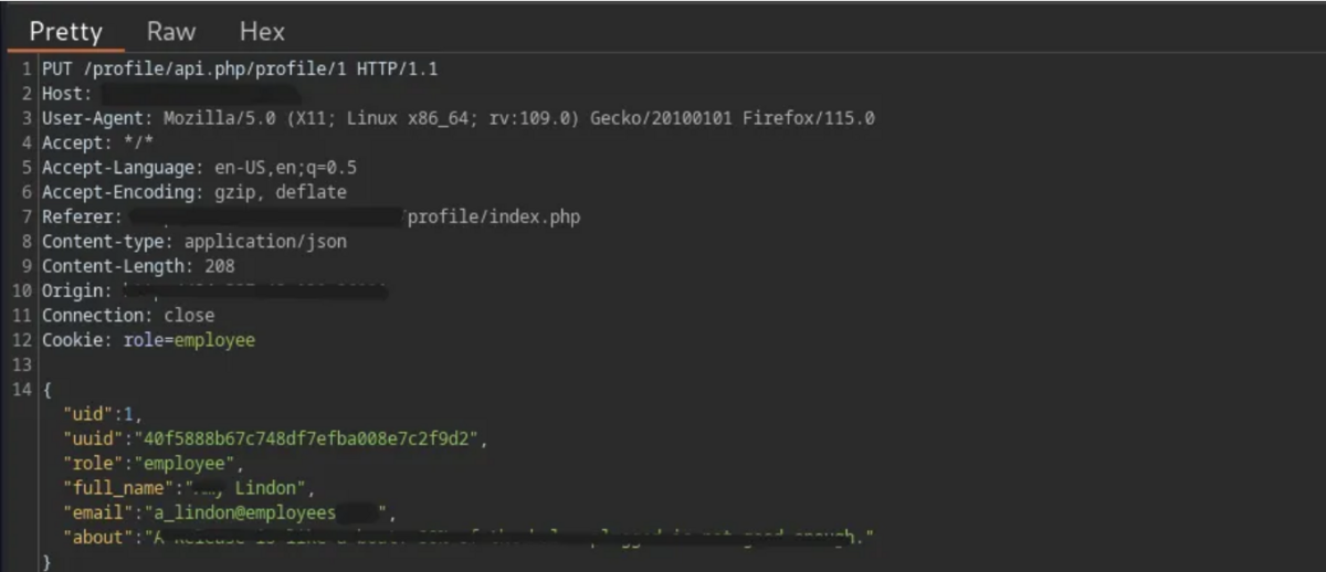 - /api/profile/1 への PUT リクエストには、uid、uuid、role などの隠しパラメータが含まれます。