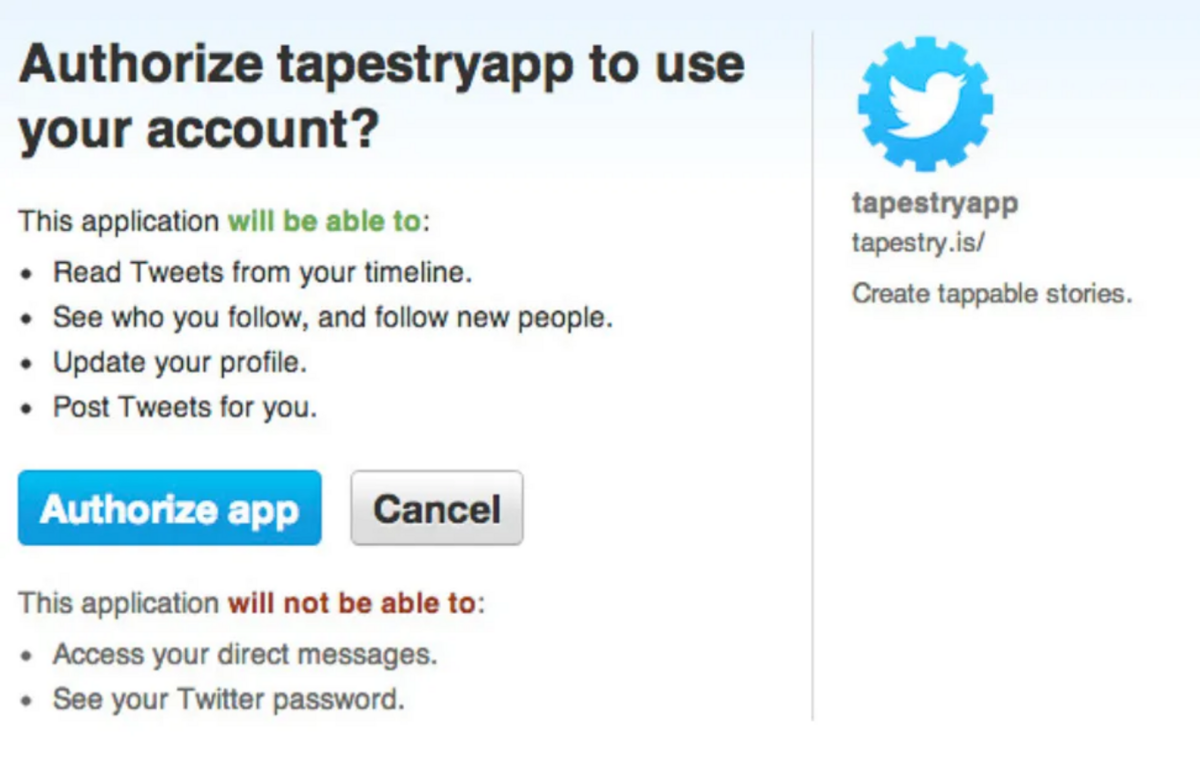 に同意ページがポップアップ表示され https://twitter.com 、どのような権限が要求されているか、およびそれを要求している開発者が誰であるかが表示されて。